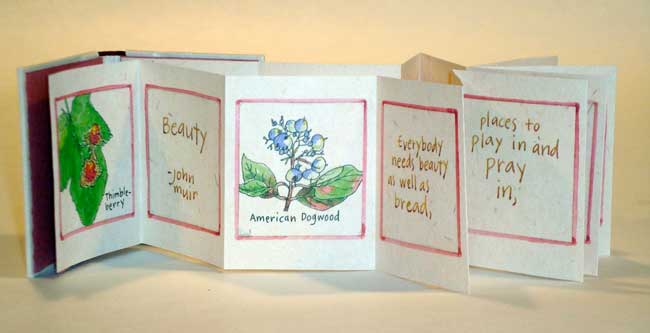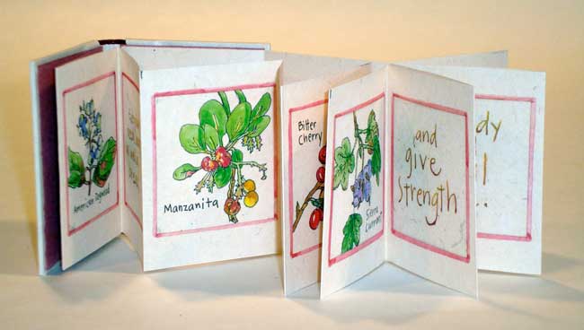This is an accordion book with 18 pages. The text is a quote by John Muir. The The text was hand drawn in Donna's "Freesans" calligraphic type face. There are 10 full page watercolor illustrations of ripe Sierra berries. This edition was color copied onto handmade paper Peter made specially for the project. The book is case bound with printed paper covers and a red leather spine.
