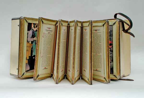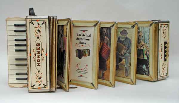 This book was made by slitting the bellows of an unrepairable vnitage Hohner student accordion to create an accordion book structure. The images and text panels were then inserted into the bellows to create the pages. The text is a history of the accordion paired with a history of the accordion book. The text was digitally set and printed on Peter's handmade paper. The rubrication around the text was hand drawn by Donna. The images are photographs of accordion players from Peter's photo collection that have been digitally printed on Peter's handmade paper and then hand colored by Donna. This is a one-of-a-kind book. It is part of a series of accordion books that started with the Real Accordion Book we made in 2001. Yes, the accordion can still be played, but only sort of,