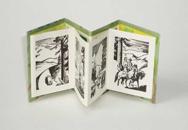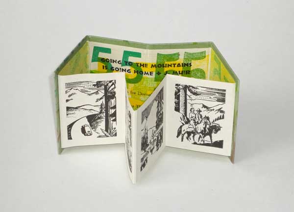 To celebrate Donna’s 55th birthday, Peter made 55 copies of a book that speaks to her favorite thing in the world: going to the mountains. The images are vintage printers cuts from an old print shop in Butte Montana, combine to tell a story of heading for the enjoyment of an outdoor life. The binding hides a secret text, a quote by John Muir (Donna’s favorite author) “Going to the mountains is going home” – and even though she lives in Santa Cruz on the Pacific Ocean this is really true for Donna. The type is ATF "Neuland" and numbers from vintage wood type. The text is letterpress printed in several colors on Peter's handmade paper. The binding is an invention of Peter's. The covers are made using Peter's handmade paper that was decorated using a technique of spraying pulp through a stencil onto the wet sheet of paper as it is being made. A little leather backpack like bag acts as a slipcase to house the book. 8 accordion pages (4 on the text sheet and 4 glued down to the cover. 55 copies. $55.