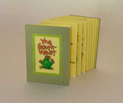 The Southwest (2010). Donna Thomas. 2 1/4 by 1 3/4 inches. This book is a series of watercolor paintings of landscapes that Donna painted in National Parks we passed through in the Southwest during our wandering book artist's gypsy wagon trip in April and May of 2010. The watercolor illustrations have been color copied on Peter's handmade paper. Pictographs, patterned after Navajo rock paintings, have been stenciled on the first and last pages using pigments gathered from the base of ? rock in Sedona, AZ. The panels used to bind the book are covered with Peter's paper made from cotton rag mixed with Yucca fiber gathered in the high desert near the Calfornia Arizona border. 16 accordion pages. 50 copies $55.