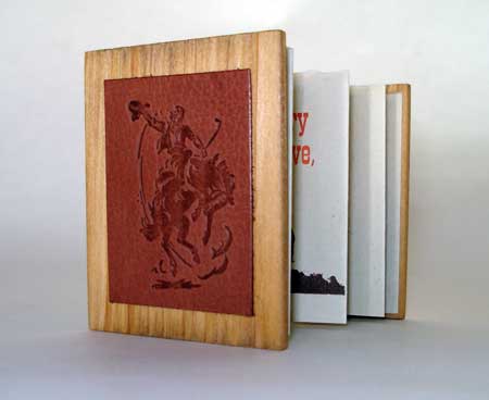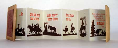 Don’t Fence Me In (2010). Cole Porter. 2 7/8 by 2 1/4 inches. The text is the first line of Cole Porter's archtypal cowboy song. Letterpress printed on Peter's handmade paper. The images are vintage printers cuts from an old print shop in Butte Montana. The type is ATF "Old Town" and is printed with a rainbow roll. The covers are made from Ponderosa Pine that was cut and milled by our cowboy friend Jim Leap in Mariposa California. A piece of saddle leather, with another vintage printers cut blind stamped on it, is mounted on the cover. 6 accordion pages. 50 copies. $55.