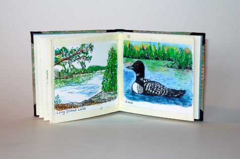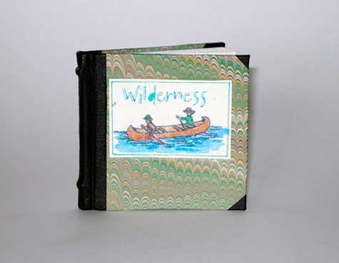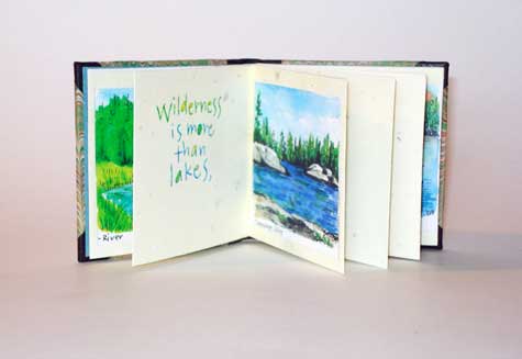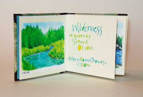 Wilderness (2009). Sigurd Olsen. 3 by 3 inches. 13 panel accordion book. The text is a quote by Sigurd Olsen, the "John Muir" of the Boundry Waters area. The book has five full page watercolor paintings that Donna painted while on a canoe trip in the Boundry Waters area of Minnesota in 2008. The illustrations and the handwritten text, (calligraphed by Donna using her own trademark typeface), have been color copied onto a white sheet of Peter's handmade paper. The book is case bound 3/4 style, with a black leather spine and corners, covered with a beautiful wave like piece of marbled paper (the boundry waters were stormy when we visited them...). 50 copies $75.